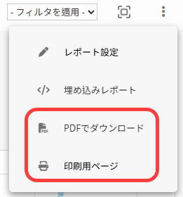 をクリックし、PDF としてダウンロード または 印刷用表示 を選択すると、レポートを PDF ファイルとして保存したり、印刷したりできます。