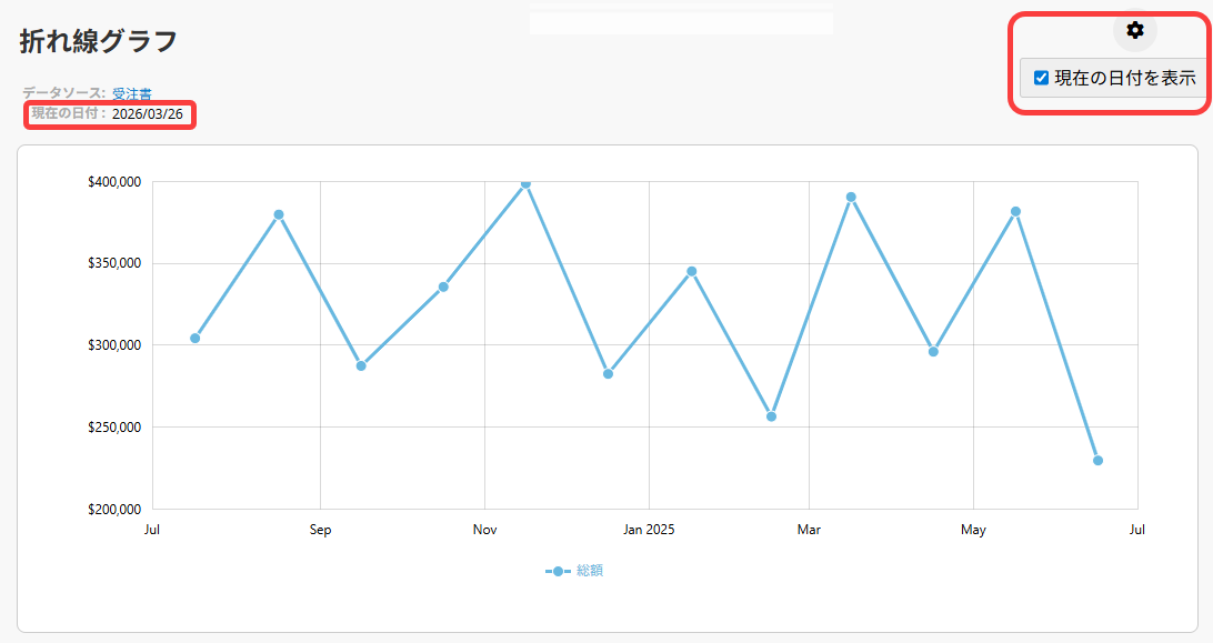 印刷用表示ページでは、右上の歯車アイコンをクリックして「現在の日付を表示」を選択すると、印刷時にレポート上部へ日付を表示できます。