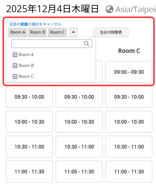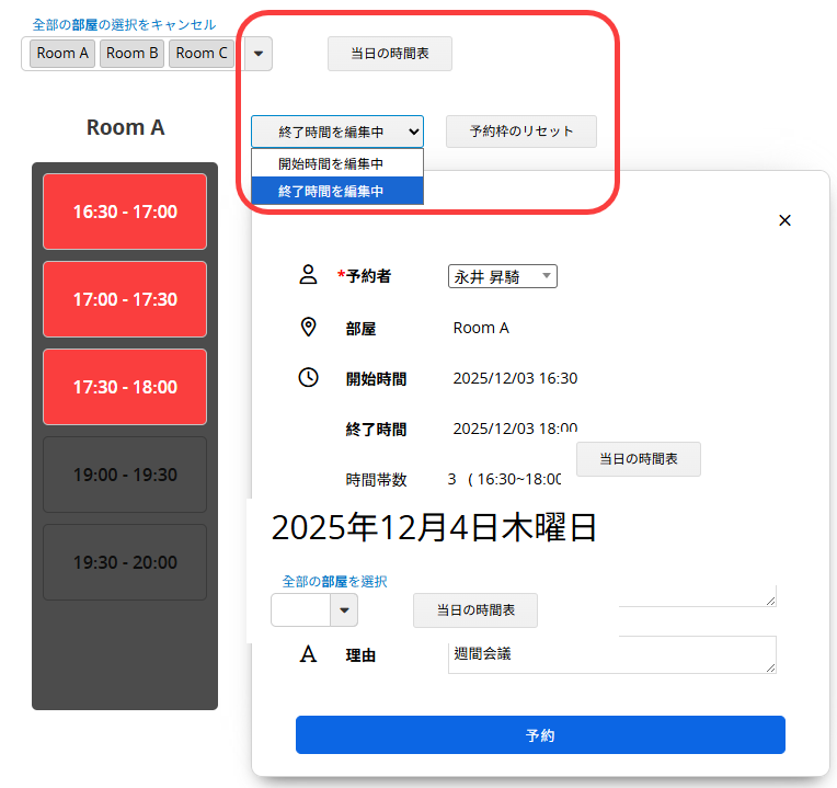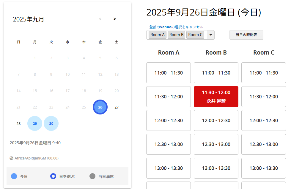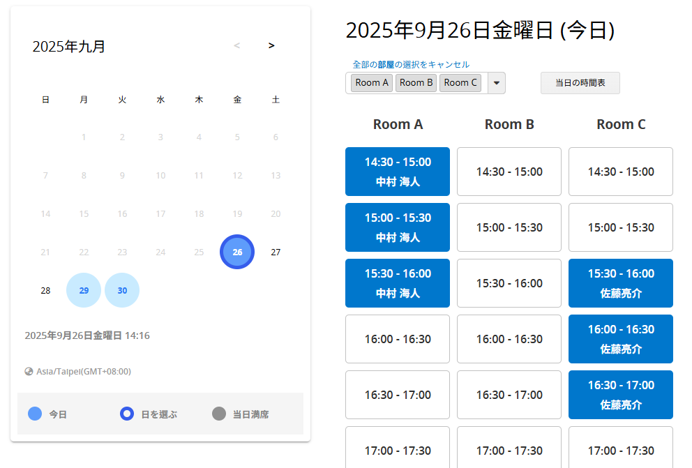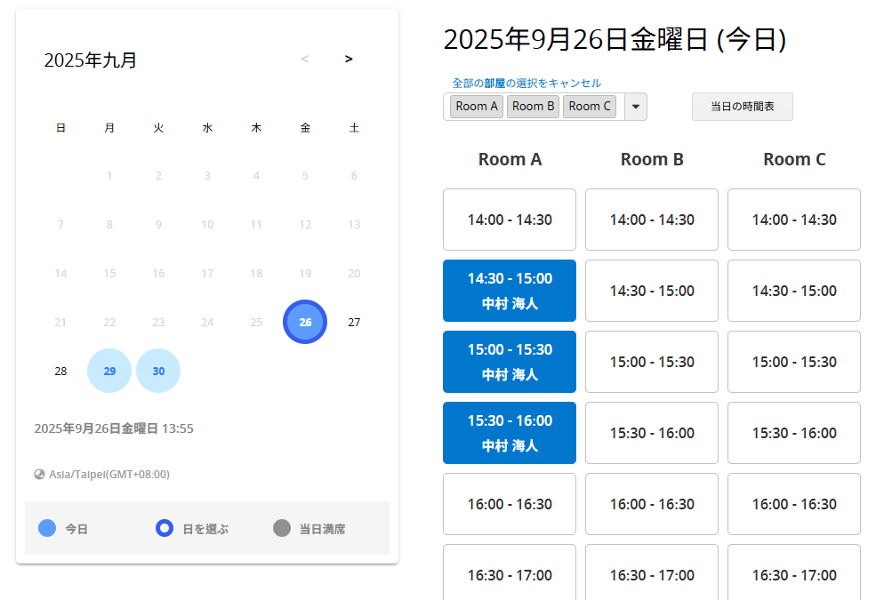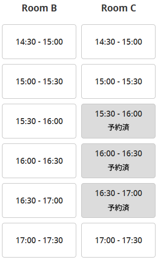 設計された予約システムは、このように機能します。 まず、予約したい日付を選択すると、予約物(会議室)を予約可能な時間が表示されます。