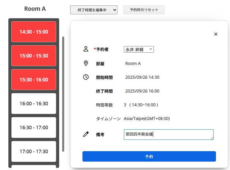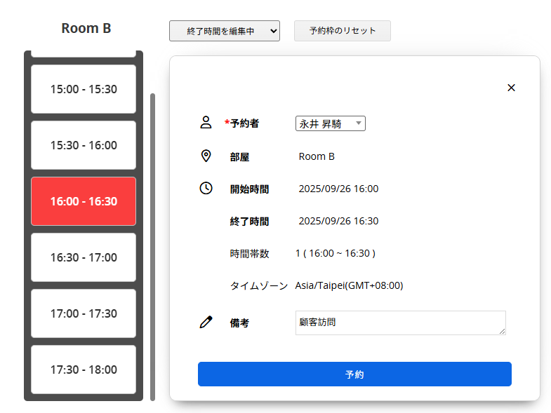 予約物を選択したら、予約したい時間をクリックし、右側のウィンドウに備考(オプション)を入力し、「予約」をクリックします。