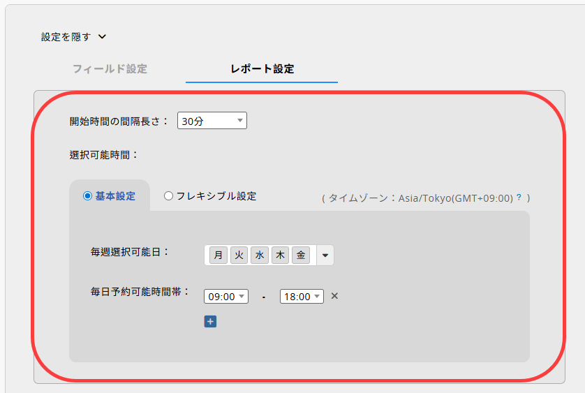 7、選択可能時間::開放の曜日と毎日の予約受付時間。フレキシブル設定を選択すると、例えば月曜日は午後から、水曜日は午前から営業するなど、より細かく時間を設定できるほか、指定日付の開店・閉店時間を設定することも可能です。