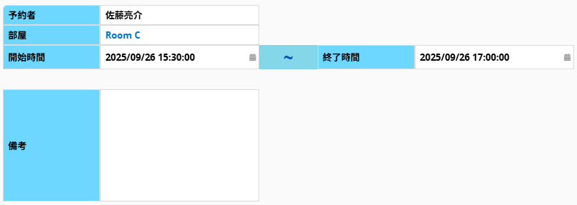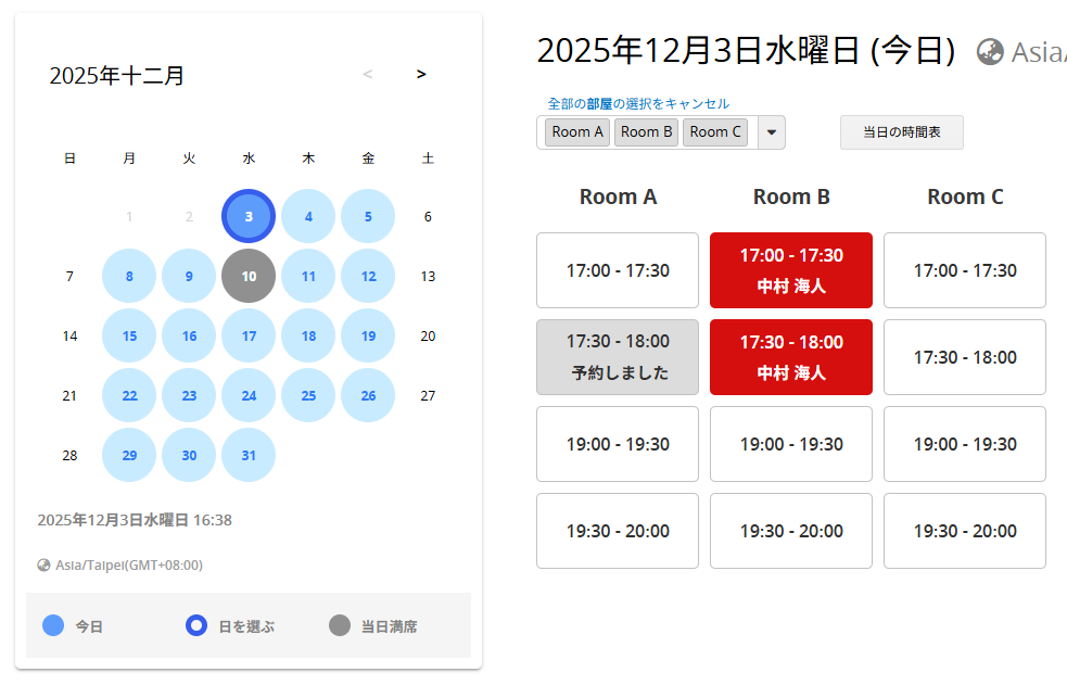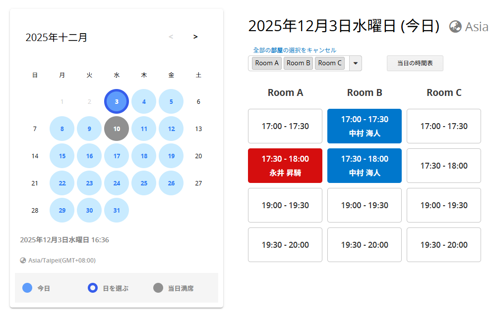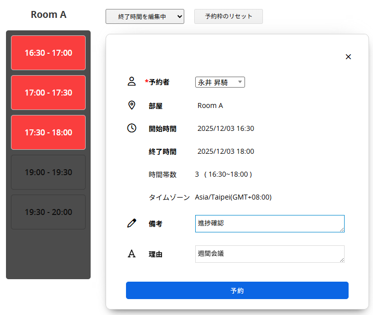 (2) 掲示板式ユーザー以上 の場合、他ユーザーが予約した時間枠は青色で表示され、予約したユーザー名も表示されます。