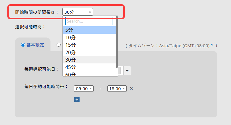 開始時間の間隔長さ: 1 回の予約枠の時間長を設定します(例:15 分、30 分、60 分)。