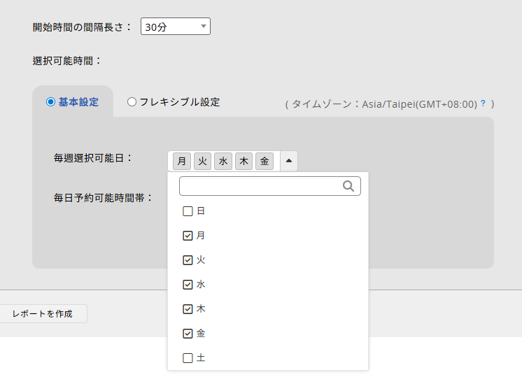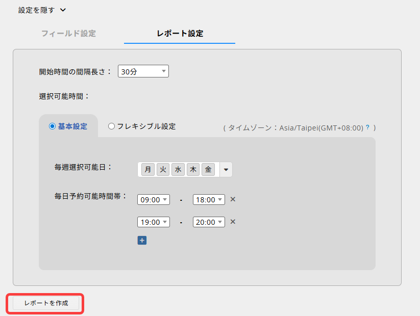 レポート設定では、予約時間に関する各種設定を行うことができます。