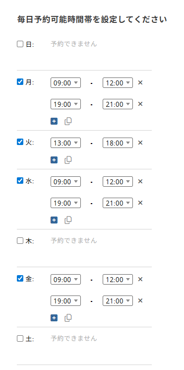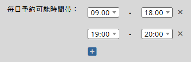 (2)「毎日予約可能時間帯」:1 日の予約可能時間枠を設定します。「+」ボタンで時間帯を追加できます。