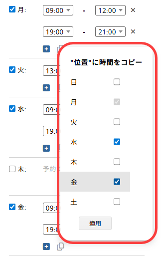 をクリックすると、同じ設定を他の選択した曜日に適用できます。