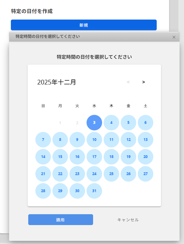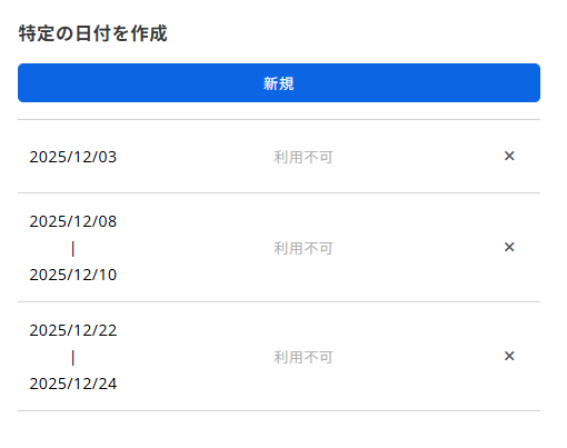 例えば、12/3(水)が祝日の場合、その日は予約不可に設定します。