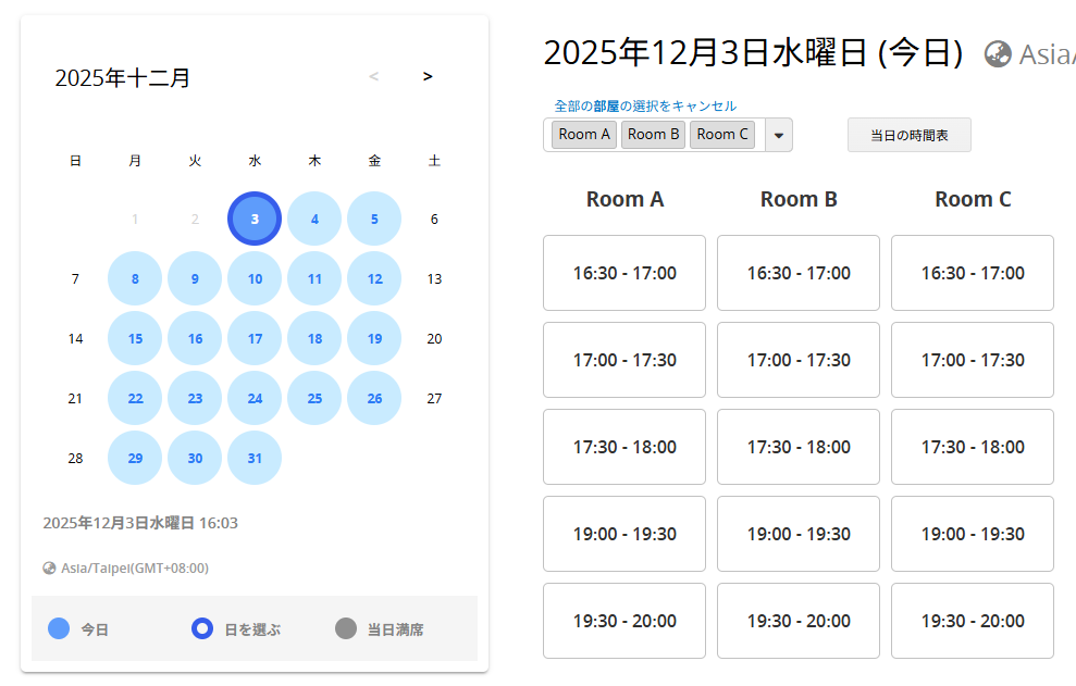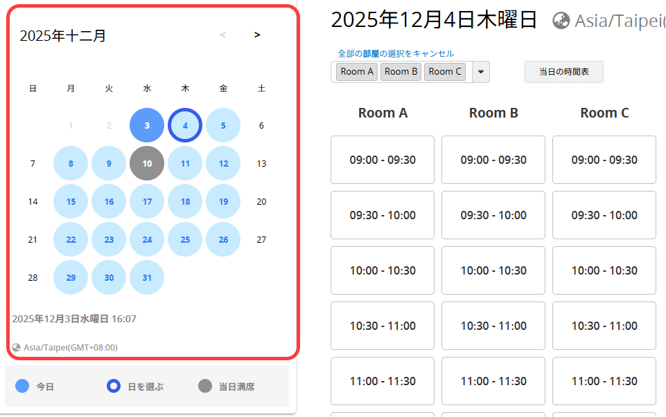 予約システムに入ったら、まず左側のセクションから日付を選択します。背景がグレーの日付は、その日がすでに満席で予約できないことを示しています。また、過去の日付は表示されません。