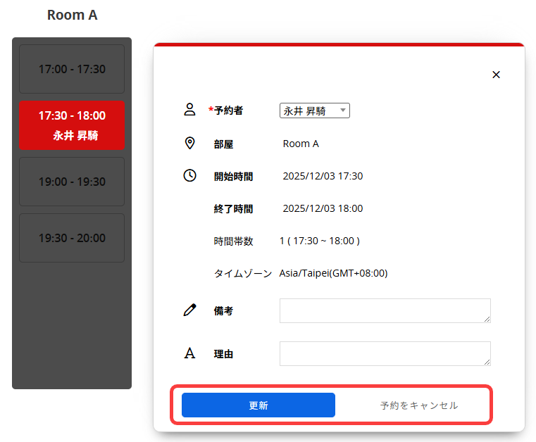 予約した時間枠をクリックすると、予約内容の更新ができ、「更新」をクリックして保存できます。予約を取り消したい場合、または予約した項目や時間枠を変更したい場合は、「予約をキャンセル」をクリックして新しい予約を行ってください。
