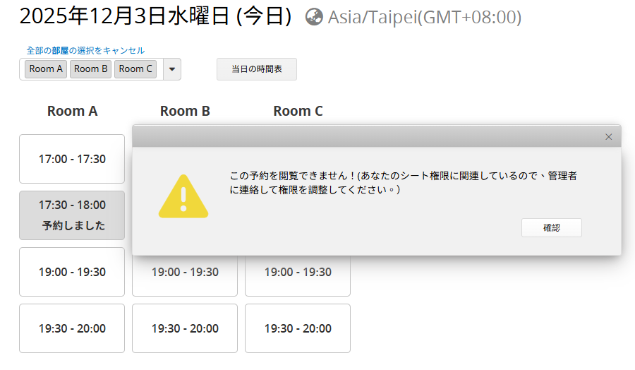初回の予約時のみ、予約内容の確認および編集が可能です。ブラウザウィンドウを閉じた後に再度予約システムへアクセスしても、以前の予約内容を編集することはできません。予約は「予約された」と表示され、クリックするとアクセス権がありませんという通知が表示されます。