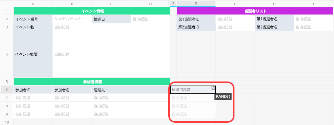 1. 「抽選」シートに「参加者」の子テーブルを追加します。参加者の基本情報に加えて、計算式に RAND() を設定した「抽選用変数」フィールドを作成します。