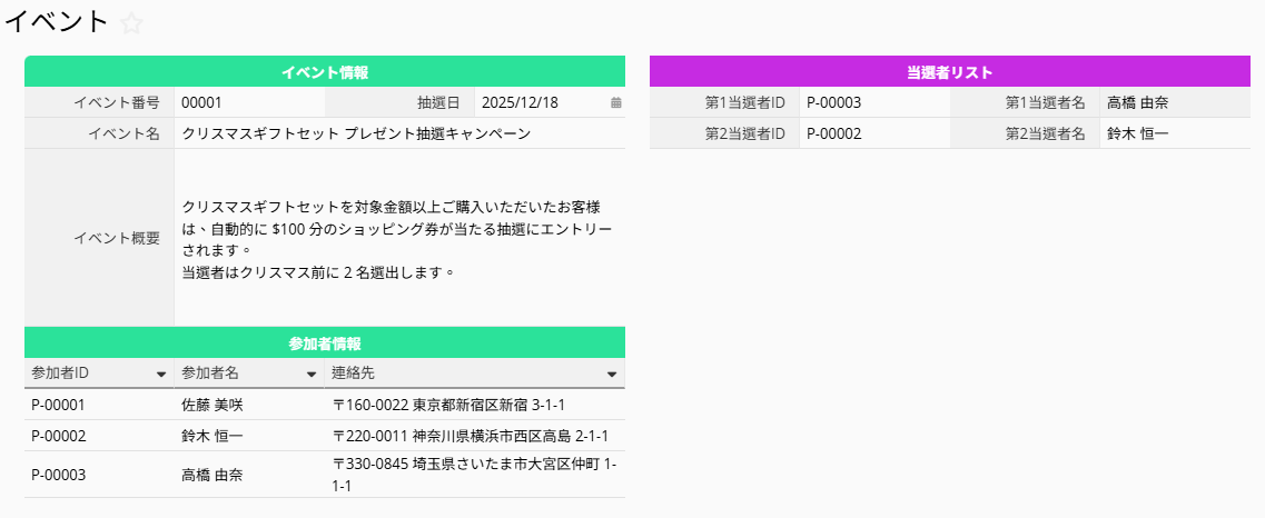 複数名を当選させたい場合は、「当選者リスト」フィールドを追加で作成し、上位のレコードを順に取得してください。