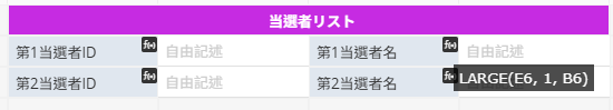 1 名を選出する場合は、LARGE("抽選用変数", 1, "参加者名") の計算式を入力すると、最も順位の高いレコードに対応する参加者名が返されます。