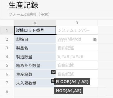 「生産記録」シートの「梱包箱数」フィールドでは、FLOOR("生産数量" / "箱あたり数量") を使用して、満箱となる箱数を計算します。