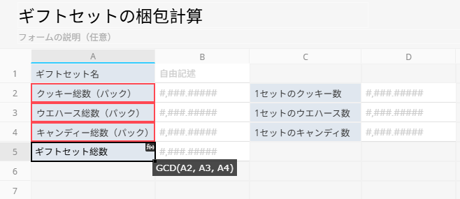 「ギフトセット梱包」シートの「ギフトセット総数」フィールドに GCD(A2, A3, A4) の計算式を設定すると、クッキー、ウエハース、キャンディの 3 種類の商品から、何セットのギフトセットを組み立てられるかを計算できます。