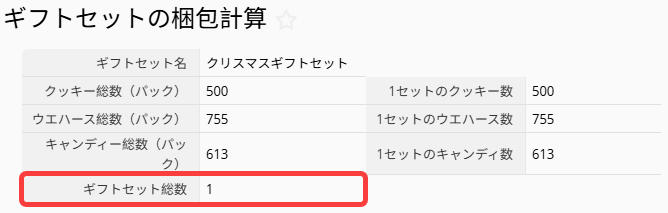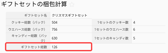 このとき、1 セットあたりの内容は「クッキー 4 パック」「ウエハース 6 パック」「キャンディ 5 パック」となります。