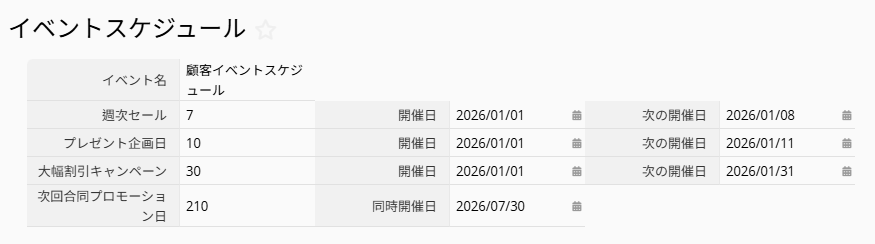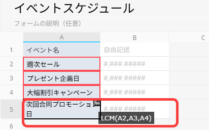「次回合同プロモーション日」フィールドに LCM(A2, A3, A4) の計算式を入力します。ここで、A2、A3、A4 はそれぞれ各イベントの周期を表すフィールドです。