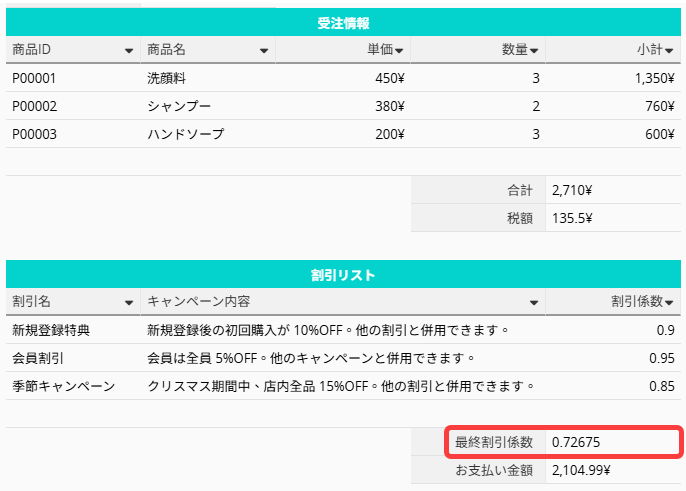 注文が「割引リスト」子テーブルに記載された複数の割引条件を満たす場合、「最終割引率」というフィールドを作成し、PRODUCT("割引率") の計算式を設定します。