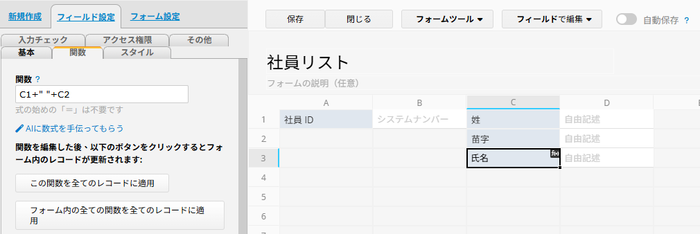 「姓」フィールドに、次の計算式を入力します: