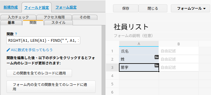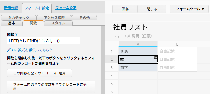 このようにすることで、「氏名」フィールドの値を自動的に「姓」と「苗字」に分割できます。