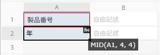 「商品番号」フィールドの値が「PRD-2023-001」で、中央の 4 桁が年を表している場合、「年」フィールドに MID(A1, 4, 4) を入力します。