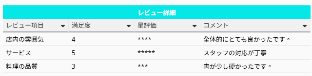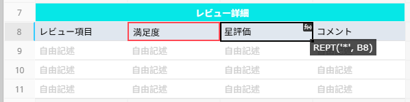 「星評価」フィールドに REPT("*", "満足度") を入力すると、評価スコアに応じて記号が自動的に繰り返され、視覚的に評価を表示できます。