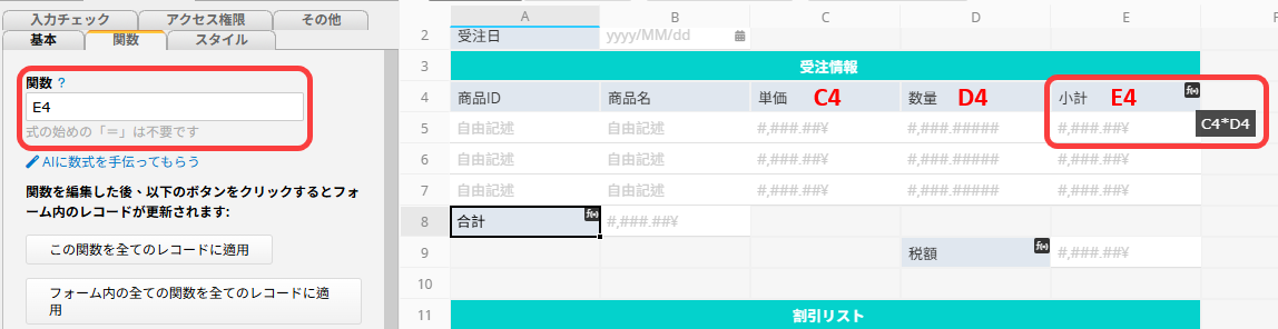 その後、合計フィールド(A8)では、子テーブル内の合計金額(E4)を参照して小計を計算します。
