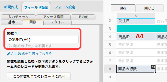 例えば、子テーブル内に何行あるかをカウントしたい場合、シートに別のフィールドを作成し、COUNT() 数式を使用するだけで対応できます。
