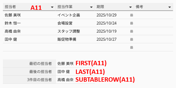 | SUBTABLEROW(value, nth_row) | 指定した行のデータを返します。中間行や特定の行を取得する際に使用します。独立フィールドでのみ使用可能です。 | SUBTABLEROW(A11, 3) |