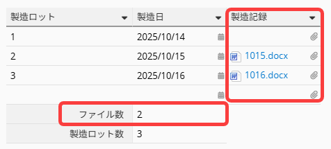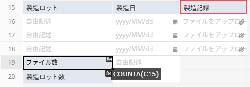 ファイル数フィールドに COUNTA(ファイルアップロード) を設定すると、ファイルがアップロードされている子テーブルのレコード数を簡単に算出できます。