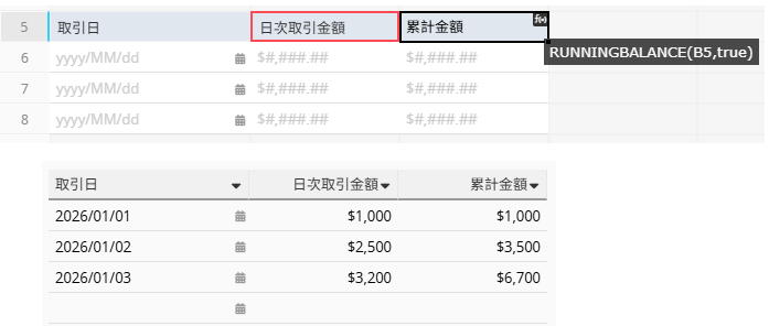 この数式は、日ごとの取引金額を順番に加算し、行ごとに累計金額を表示します。また、バックエンドでの自動再計算も可能になります。