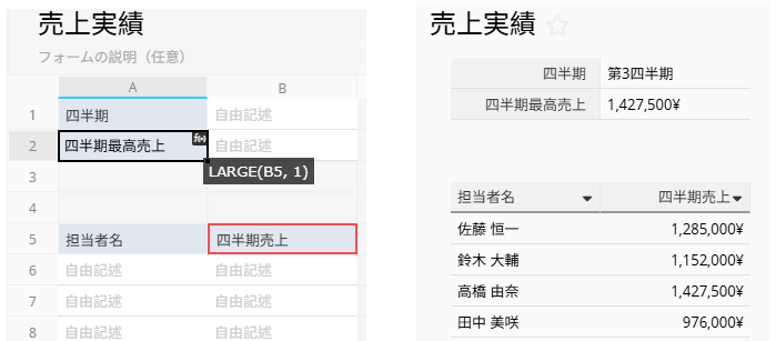 | LARGE(arg, nth, ["arg2"]) | 子テーブルのフィールドを参照し、ある列の順位(nth)を基準に、同じ行にある別の列の値を返します。詳細は こちら。 |