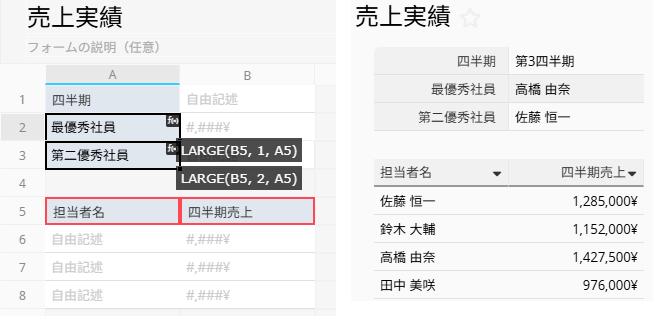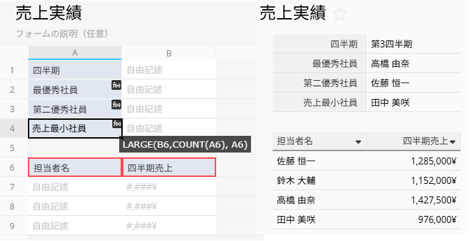 例:LARGE("四半期売上", COUNT("四半期売上"), "担当者")