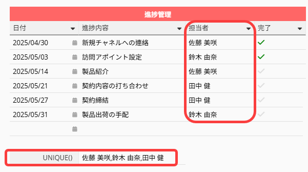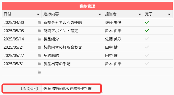 UNIQUE():参照した子テーブルフィールド内の重複しない値を一覧表示します。
