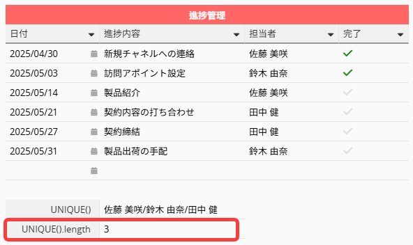 UNIQUE().length:参照した子テーブルフィールド内の重複しない値の件数を計算します。