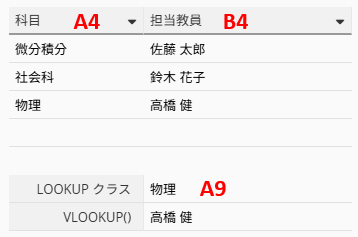 VLOOKUP(A9, A4, B4, false, false) または VLOOKUP(A9, A4, B4)