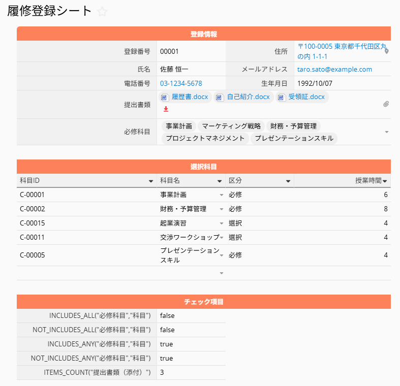 例えば「履修登録シート」では、「必修科目」フィールドに必須科目がすべて一覧表示されています。