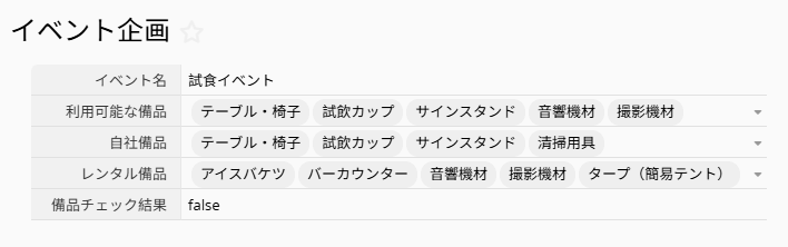 以下の例では、「利用可能な備品」に両方のフィールドに含まれるすべての機材が揃っていないため、システムは false を返します。