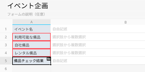 例えば「イベント企画」シートでは、機材が「自社備品」と「レンタル備品」に分かれているとします。
