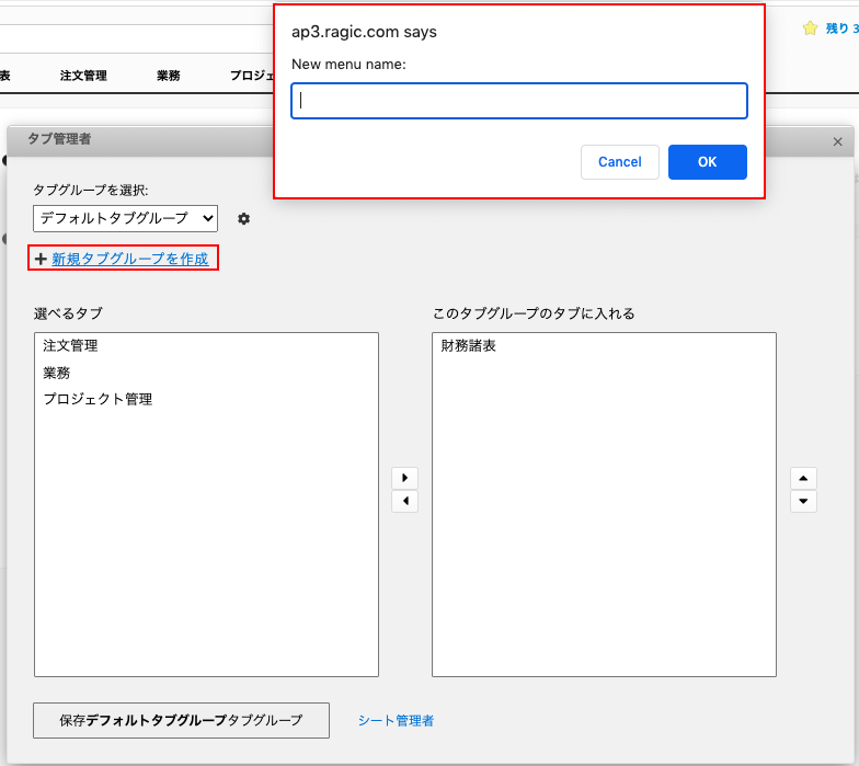 右上のギアアイコンをクリックすると、タブメニューの名前変更や削除、並べ替えも可能です。