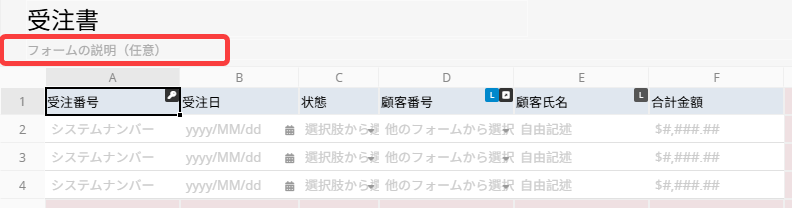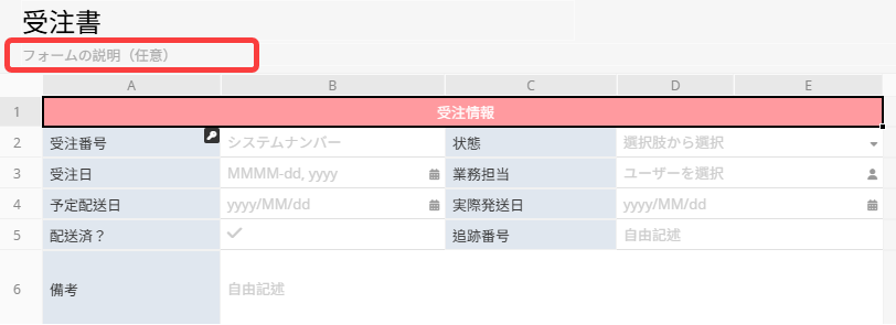 フォーム説明は、シートの目的を示したり、入力時に注意すべきポイントを補足したりするために設定できます。これにより、ユーザーはシートの使い方やワークフローをより理解しやすくなります。