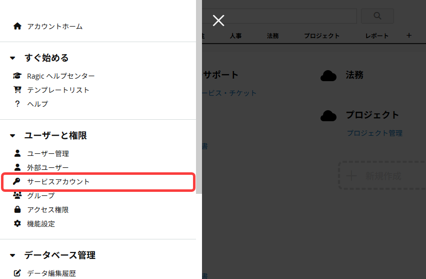 左上のハンバーガーメニューをクリックし、ユーザーアクセスの サービスアカウント を選択してください。