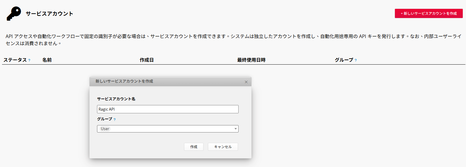 API アクセスや自動化ワークフローで固定の実行ユーザーが必要な場合は、サービスアカウントを作成できます。システムが独立したアカウントを作成し、自動化用途の専用 API キーを発行します。内部ユーザーのライセンスは消費しません。