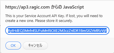 サービスアカウント作成後、API キーを表示するウィンドウが開きます。