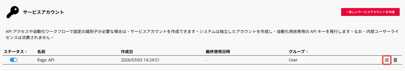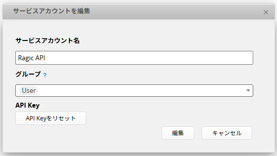 右側の編集アイコンをクリックすると、新しい API キーの発行、または サービスアカウント名 と グループ の変更ができます。