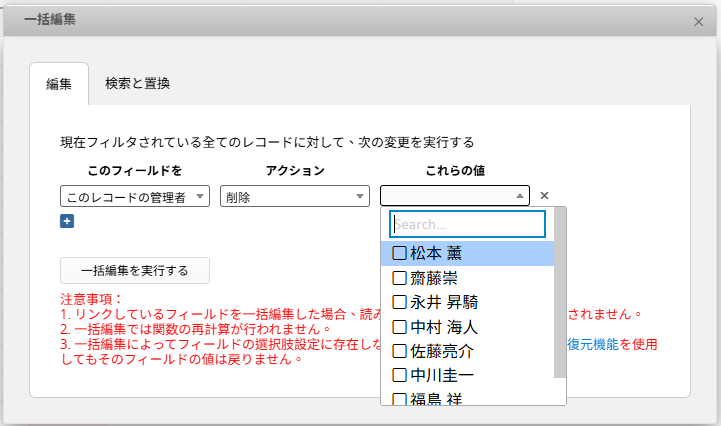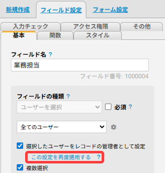 注意:この機能は子テーブルフィールドには適用されません。子テーブルフィールドにユーザーやグループを割り当てても、そのユーザーをそのレコードのレコード管理者として設定することはできません。必ず独立フィールドに対してこの機能を設定してください。