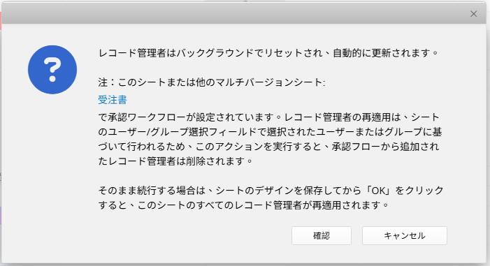 1. この操作では、シート内の割り当てフィールド(ユーザーおよびグループ)に基づいてレコード管理者が再割り当てされ、承認フローによって追加されたレコード管理者は削除されます。