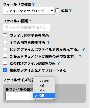 また、フィールド内の1つのアップロードファイルサイズを最大1GBに制限することができます。