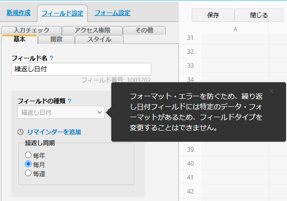 デフォルトのフィールド形式は自由入力、他のスプレッドシートと同様に、ユーザーが制限なく何でも入力できるようになっています。しかし、多数の場合、正しい入力タイプを選択することで、ワークシートはより使いやすくなります。デザインモードでは、左側のデザインパネルで、フィールド設定の基本の下に、フィールドの種類があります。