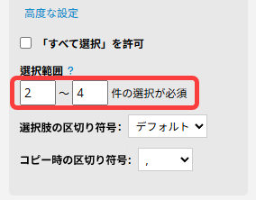 2. 選択範囲:選択可能な数の最小値と最大値を設定できます。それぞれ個別に、または両方同時に設定可能です。制限を適用しない場合は、該当欄を空白のままにしてください。